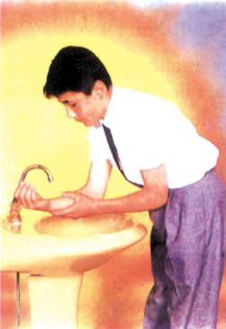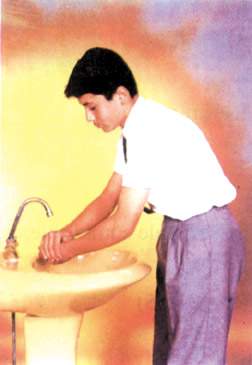 Eller bileklere kadar üç kere yıkanmalıdır. Parmak aralarının yıkanmasına dikkat edilmelidir. Yıkanırken bir elin parmakları diğer elin parmakları arasına geçirilerek hilallenir. Yüzük varsa oynatılarak altına su geçmesi temin edilir.