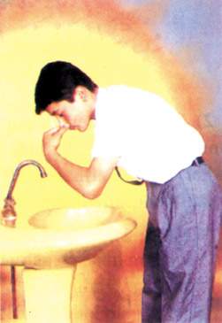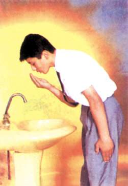 Sağ avuç ile buruna üç kere ayrı ayrı su çekilir. Sol el ile sümkürülerek burun temizlenir. Oruçlu olanlar buruna suyu çok hızlı çekmezler.