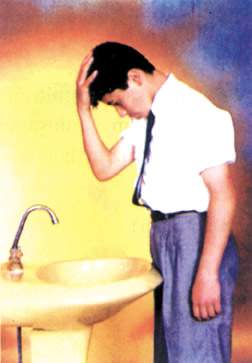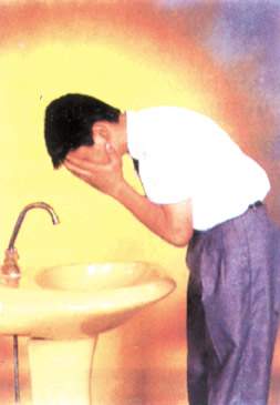 Alında saçların bittiği yerden itibaren kulakların yumuşağına ve çene altına kadar yüzün her tarafı üç kere yıkanır. Su yüze çarpılmaz.