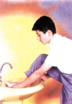 Önce sağ ayak, sonra sol ayak, topuk kemikleriyle beraber, sol elle yıkanır. Parmak araları sağdan sola doğru hilallenir.